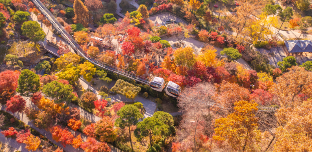 단풍 터널, 연못, 목조 다리, 모노레일 역 주변, 숲 사이로 비치는 햇살 등 다양한 포토존이 숲 곳곳에 있습니다. 특히 단풍 시즌엔 붉은색·노란색·주황빛 잎들이 어우러지는 풍경이 장관입니다. (토깽이 월드) - 주차 및 대중교통