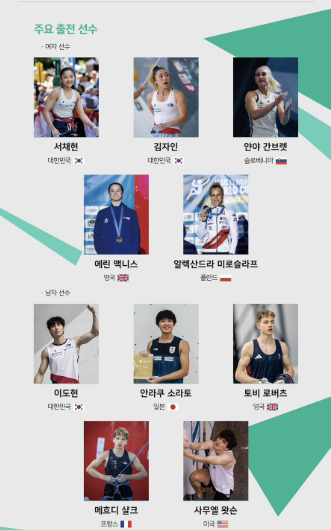 - 한국은 개최국 자격으로 24명 국가대표 + 장애인(파라클라이밍) 국가대표 3명이 출전할 예정입니다. (스포츠칸)